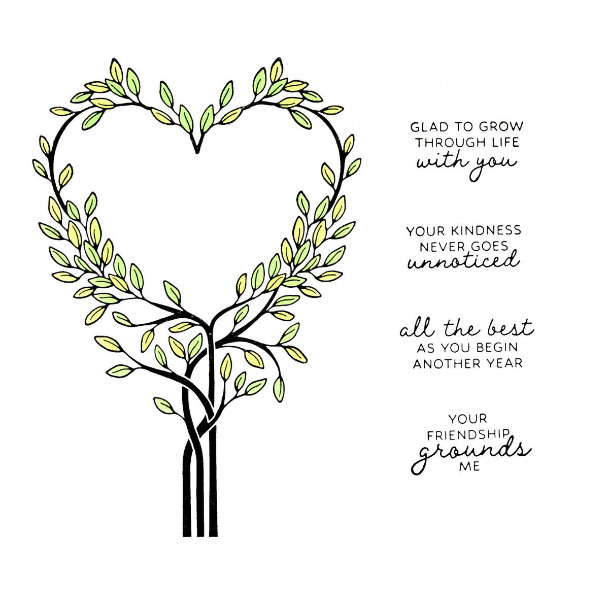 Flourish & Vine Press Plate, Die Set & Stencil Set is the December 2025 release plate for the independent retailers' exclusive BetterPress Society. A sweet heart shaped vine is the focal point of this set, with four coordinating sentiments for the center. A registration template is included to ensure you get perfect placement for the sentiments, including 'Glad to Grow Through Life With You,' and 'Your Friendship Grounds Me.' A coordinating die cuts out the center of the heart to add more creative possibilities to this set. Try a shaker card, or add a peek-a-boo sentiment!