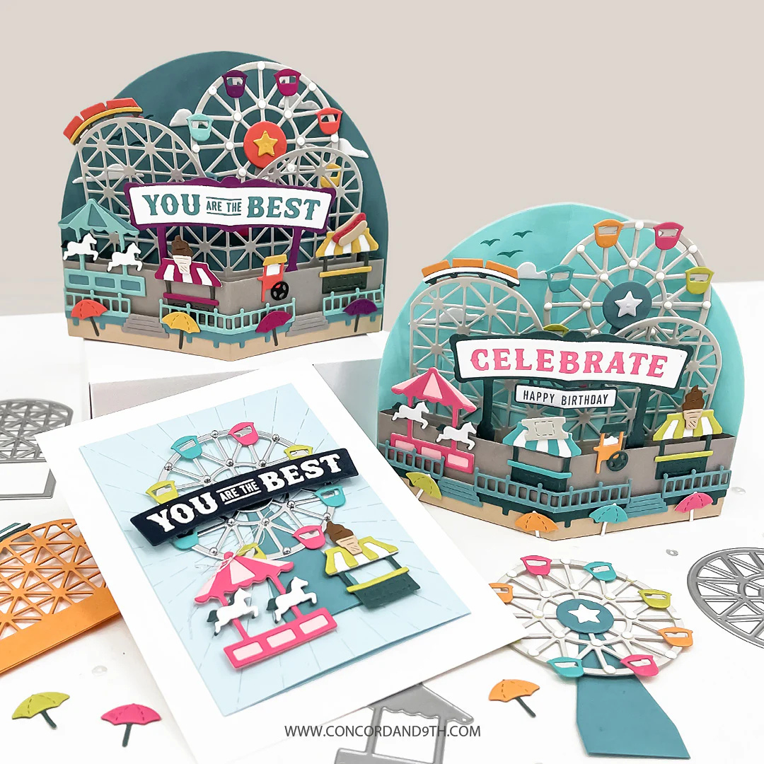 Step right up, the Boardwalk Stacks Dies hold the ticket to your next crafty adventure! This wildly fun die set brings all the magic of a carnival to your cards and other projects with detailed pieces to create roller coasters, ferris wheels, carousels, snack stands, game booths, and more. Piece them together on a traditional card front or really make them stand out with the Pop-Out Stacks Base Dies. Coordinates with the Boardwalk Stacks Stamp Set. 29 pieces.